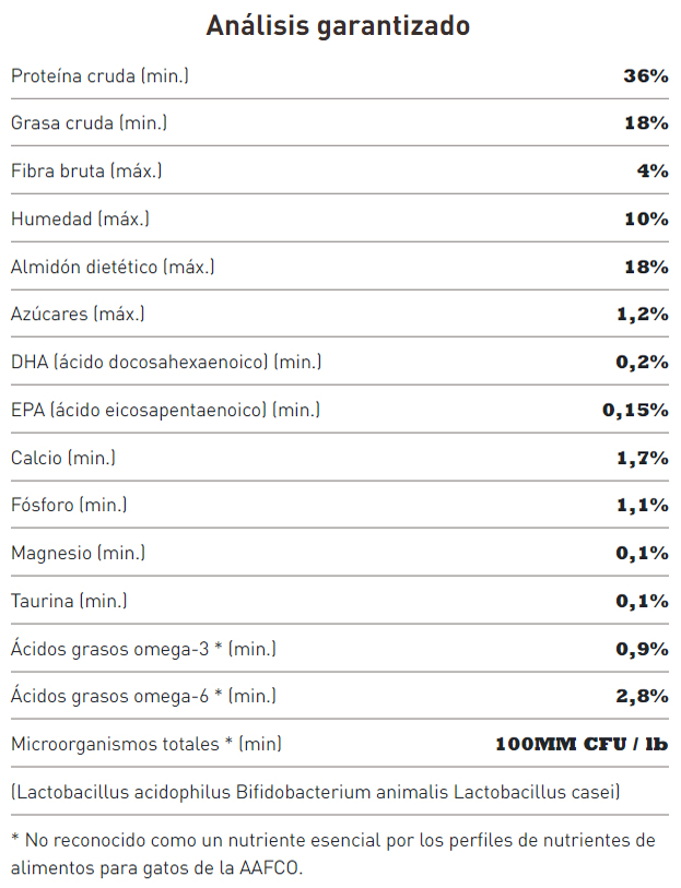 ENERGÍA METABOLIZABLE: 3850 kcal / kg (439 kcal por taza de 8 onzas líquidas), con 37% de proteínas, 23% de carbohidratos y 40% de grasas.