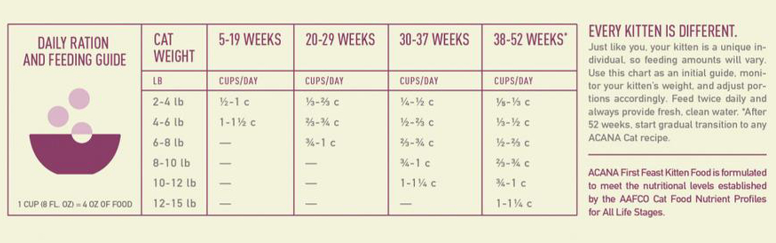 La receta de ACANA First Feast está formulada para cumplir con los niveles nutricionales establecidos por los perfiles de nutrientes de alimentos para gatos de la AAFCO para todas las etapas de la vida.