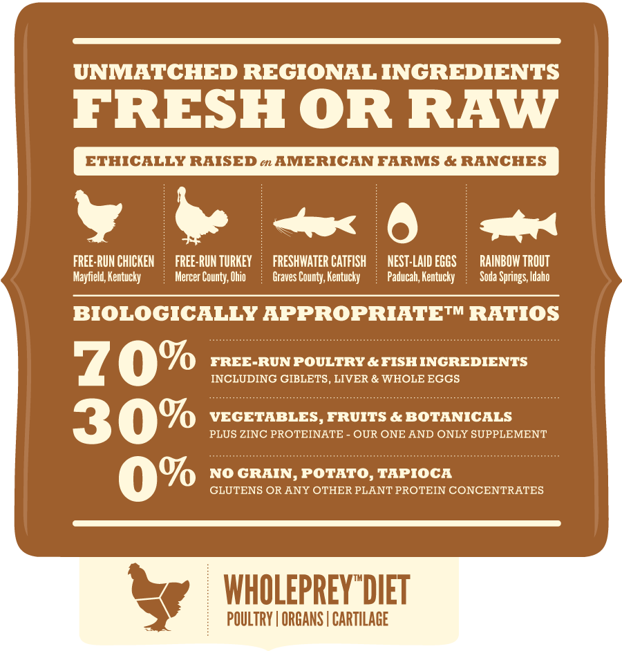 -Pollo y pavo de corral -carne, hígado, riñones y cartílago frescos de granjas locales.