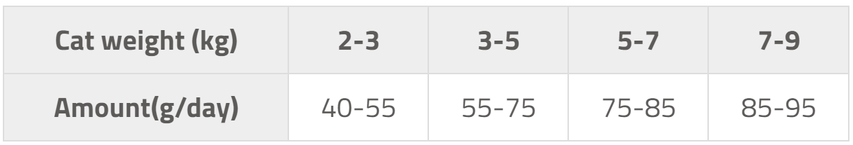 Componentes analíticos: proteína bruta 31,0 %, grasa bruta 13,0%, fibra bruta 3,0 %, ceniza bruta 8,8 %, humedad 10,0%, omega-3 0,4 %, omega-6 1,2 %, calcio 0,8 %, fósforo 0,7%, sodio 1,0 %, magnesio 0,04 %.