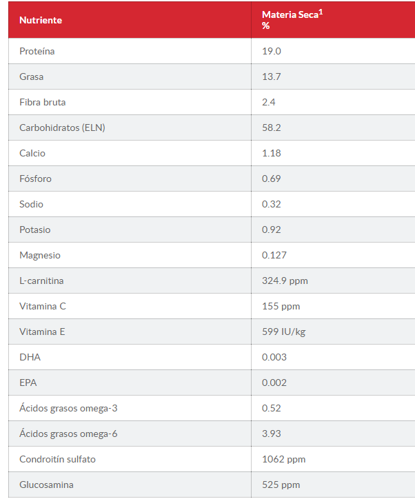 INGREDIENTES: Chicken Meal, Cracked Pearled Barley, Brewers Rice, Whole Grain Wheat, Whole Grain Corn, Whole Grain Sorghum, Chicken Fat, Dried Beet Pulp, Whole Grain Oats, Chicken Liver Flavor, Soybean Meal, Soybean Oil, Lactic Acid, Pork Flavor, Flaxseed, Potassium Chloride, Calcium Carbonate, Iodized Salt, Choline Chloride, vitamins (Vitamin E Supplement, L-Ascorbyl-2-Polyphosphate (source of Vitamin C), Niacin Supplement, Thiamine Mononitrate, Vitamin A Supplement, Calcium Pantothenate, Riboflavin Supplement, Biotin, Vitamin B12 Supplement, Pyridoxine Hydrochloride, Folic Acid, Vitamin D3 Supplement), L-Lysine, minerals (Ferrous Sulfate, Zinc Oxide, Copper Sulfate, Manganous Oxide, Calcium Iodate, Sodium Selenite), Taurine, DL-Methionine, Oat Fiber, Mixed Tocopherols for freshness, Natural Flavors, L-Carnitine, Beta-Carotene, Apples, Broccoli, Carrots, Cranberries, Green Peas.
