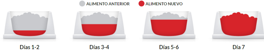 - ¿Nuevo en este alimento? Mezcle cantidades cada vez mayores del alimento nuevo de su mascota con cantidades cada vez menores del alimento anterior durante un periodo de 7 días.