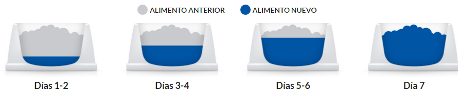 - Haga una transición gradual hacia el nuevo alimento de su mascota durante un periodo de 7 días.