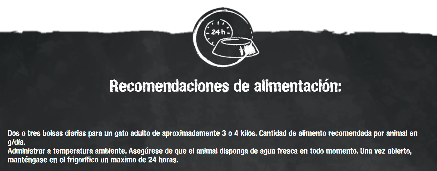 Aditivos nutricionales: vitamina D3 200 UI; vitamina E 50 mg; taurina 1.000 mg; manganeso (como sulfato de manganeso II) 2 mg; zinc (como sulfato de zinc, monohidrato) 20 mg; yodo (como yodato cálcico, sin agua) 0,2 mg