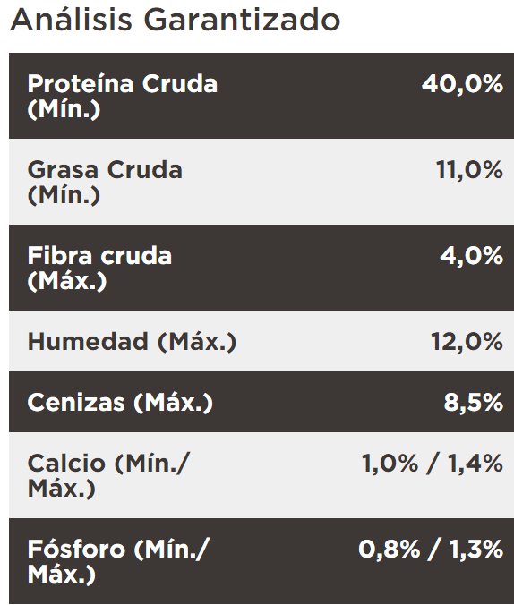Amarillo, gluten de trigo, grasa animal (res y/o pollo y/o cerdo) preservada con tocoferoles mezclados (fuente de vitamina E), fibra de soya, levadura seca de cervecería (inactiva), sal, huevo en polvo, digesto animal (hidrolizado de subproductos de cerdo y/o pollo), ácido fosfórico y/o bisulfato de sodio, aceite de pescado, cloruro de potasio, L-lisina, cloruro de colina, taurina, DL-metionina, ácido ascórbico (fuente de vitamina C), carbonato de calcio, ortofosfato de calcio, sulfato de zinc, proteinato de zinc, sulfato ferroso, suplementos vitamínicos (E, A, B-12, D-3), suplemento de riboflavina, niacina, pantotenato de calcio, sulfato de manganeso, proteinato de manganeso, biotina, mononitrato de tiamina, ácido fólico, sulfato de cobre, proteinato de cobre, clorhidrato de piridoxina, complejo sódico de bisulfito de menadiona (fuente de actividad de vitamina K), iodato de calcio, selenito de sodio.