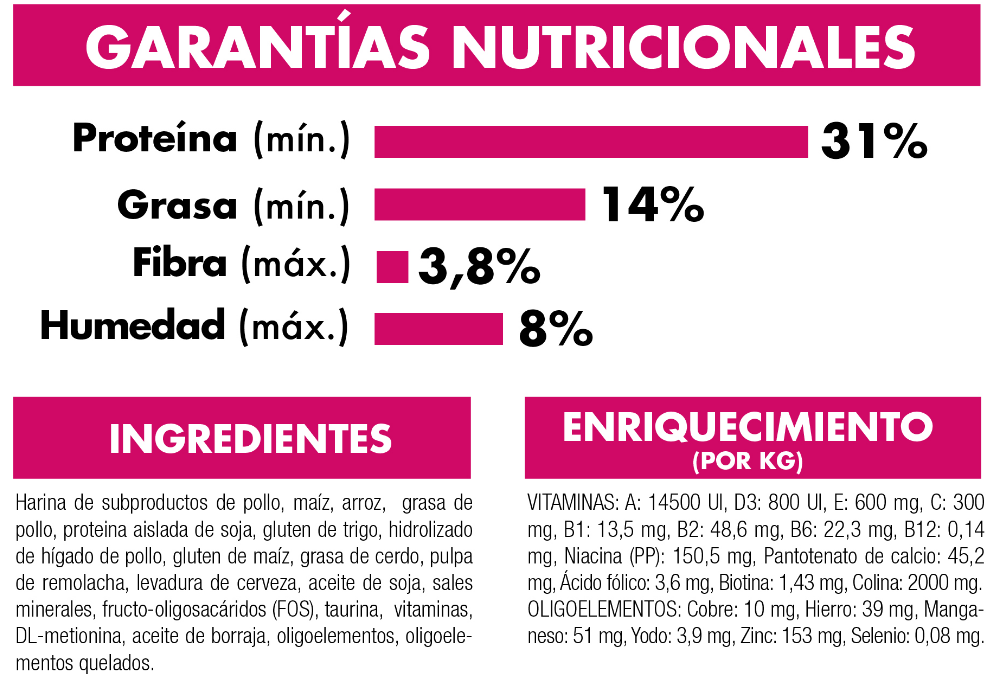 - El complejo de nutrientes activos, con biotina y aceite de borraja (rico en omega 6), contribuye a la belleza del pelaje.
