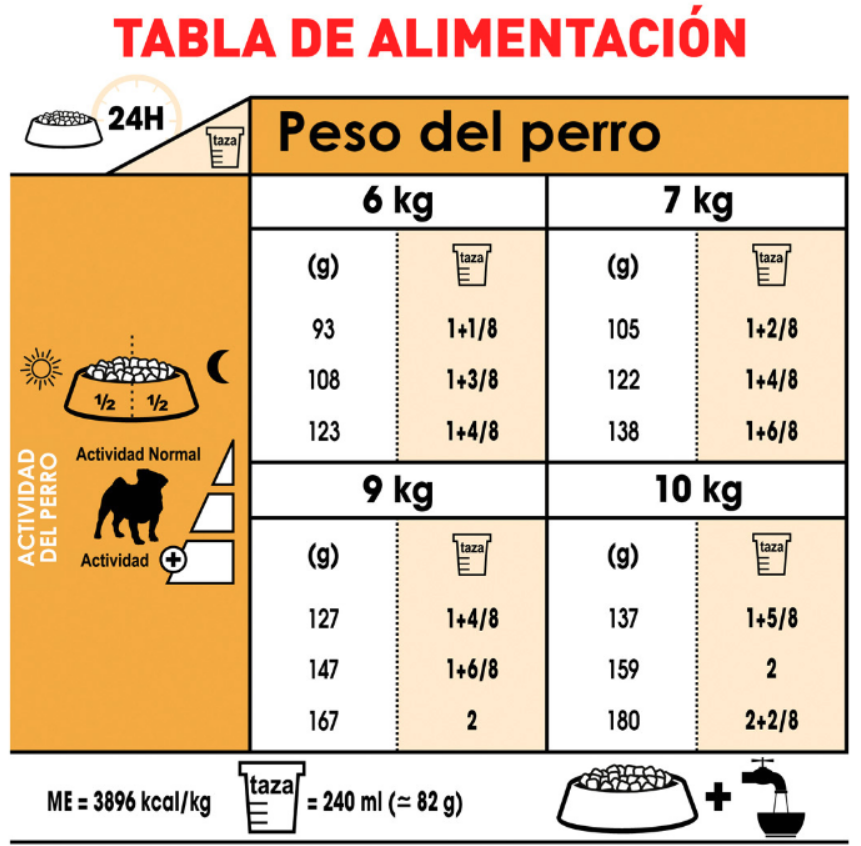 Los Pug tienen tendencia al sobrepeso, por lo que resulta especialmente importante una dieta equilibrada. La forma especial de su cráneo y mandíbulas cortas (tipo braquicefálicos) hacen que sus vías respiratorias sean estrechas, lo que causa una dificultad respiratoria con consecuencias para el tránsito digestivo. La alimentación puede ser difícil, por lo que los Pug necesitan una croqueta especial que les sea fácil consumir y les ayude a masticar. Royal Canin Pug Adulto ha sido desarrollado específicamente para la raza en etapa adulta (desde los 10 meses) para contribuir a la función barrera de la piel (gracias a un complejo exclusivo) y mantener la salud cutánea (EPA-DHA).